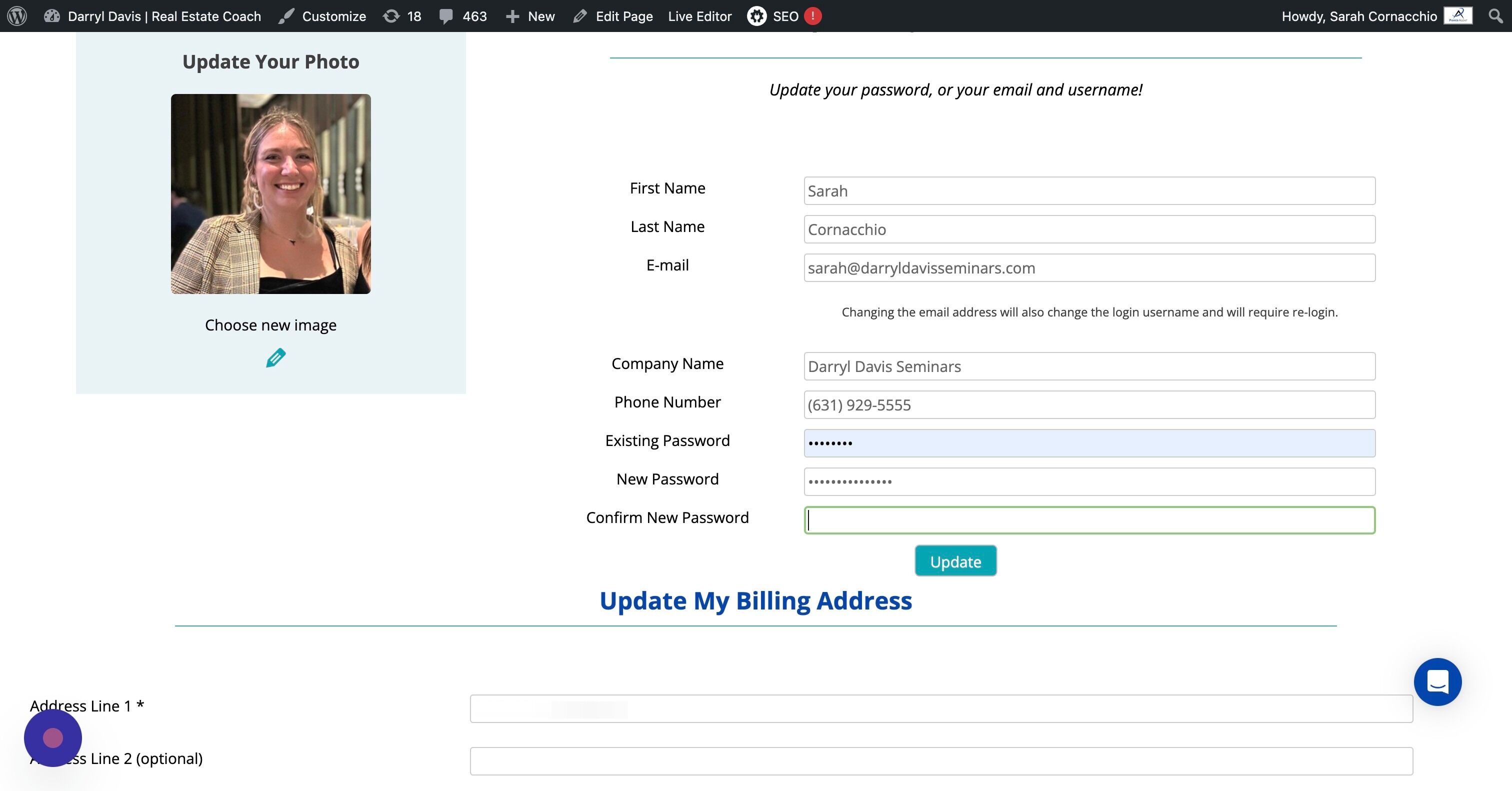 Tutorial – How to Change Your Password 1. Navigate to your Dashboard. 2. Click "Profile & Billing" 3. Click the "Existing Password" field. 4. Click the "New Password" field and type in what you'd like to change your password to. 5. Click the "Confirm New Password" field and type in the new password again. Make sure they match! 🙂 6. Click Update.