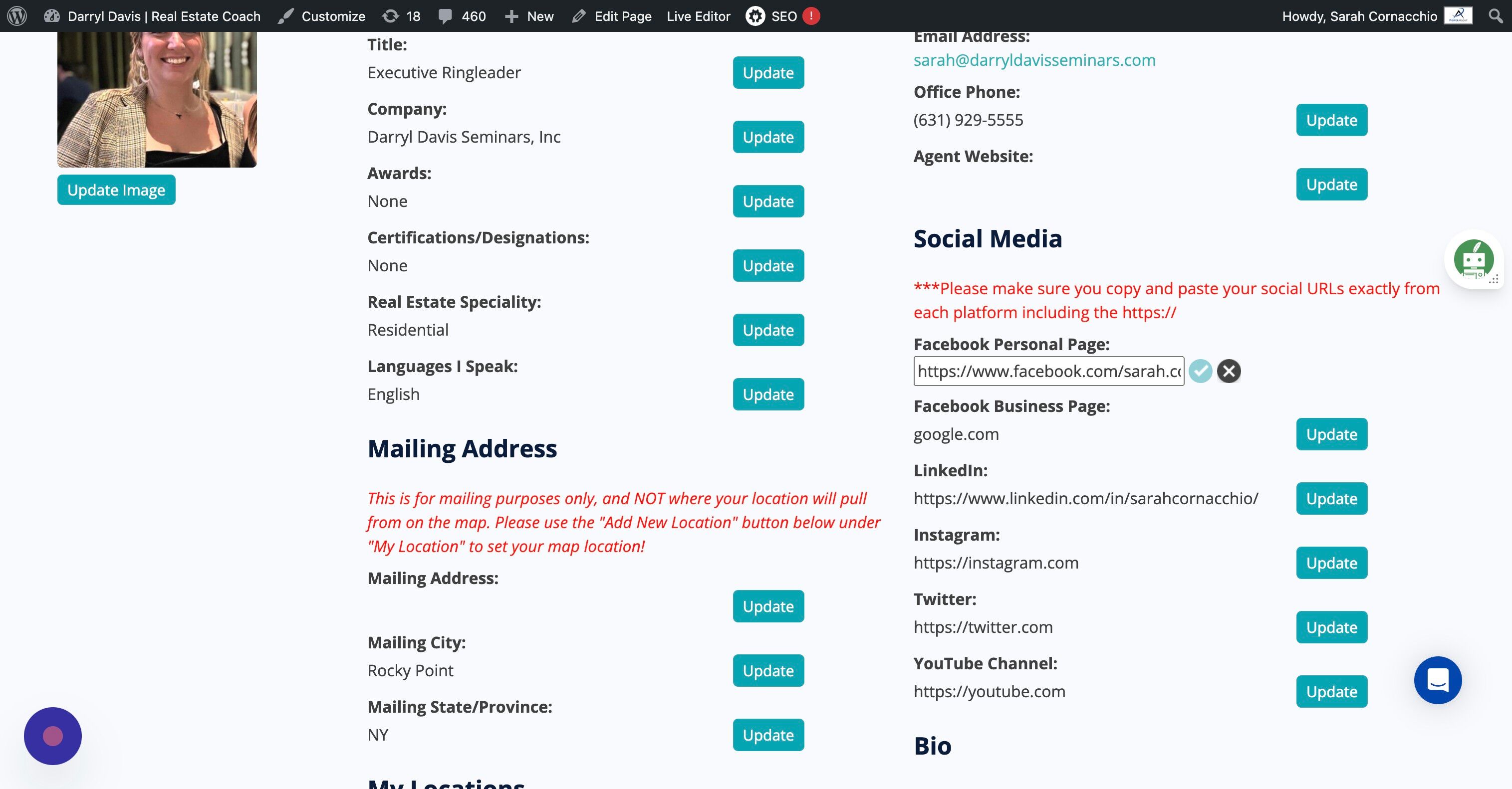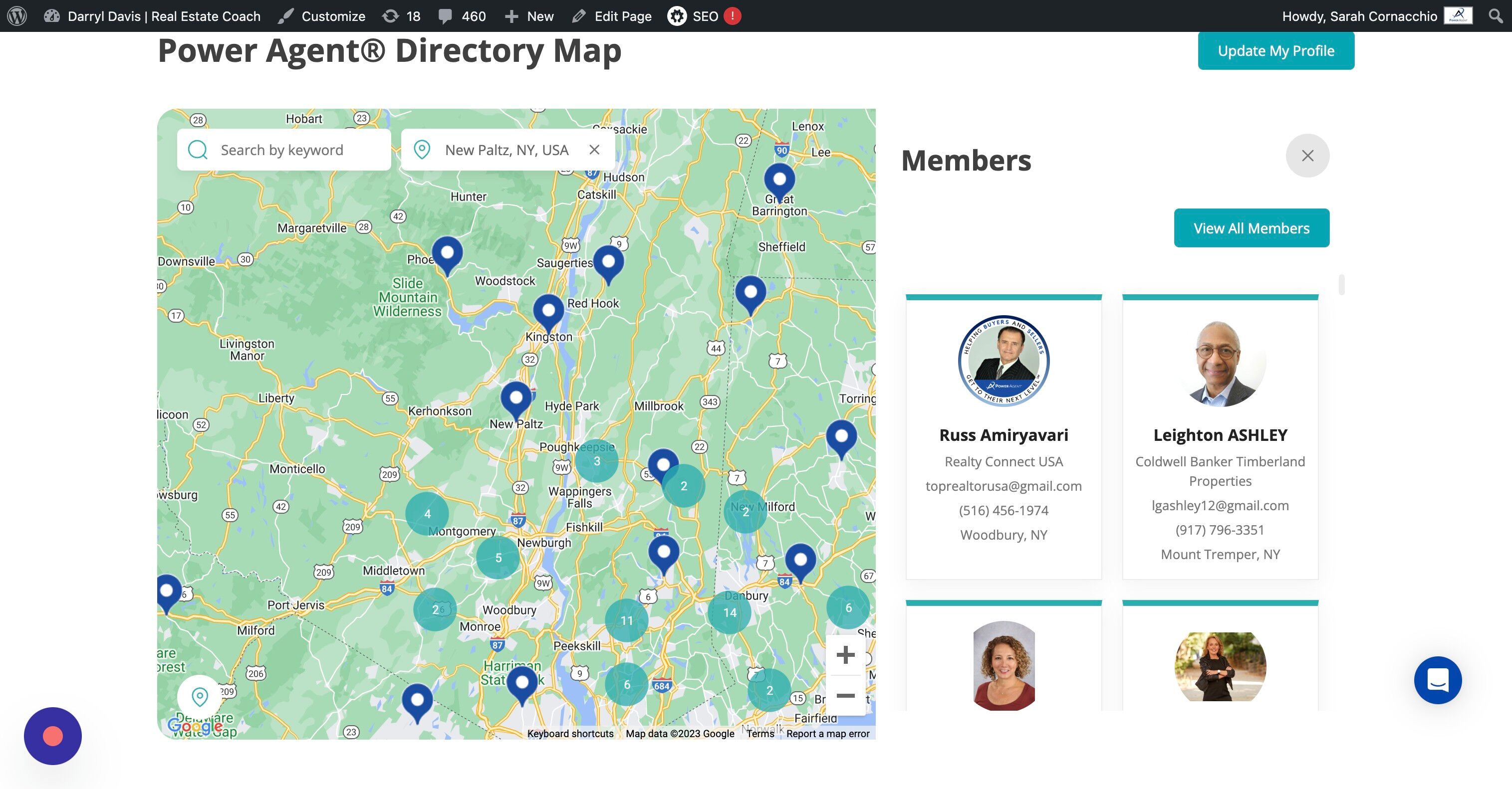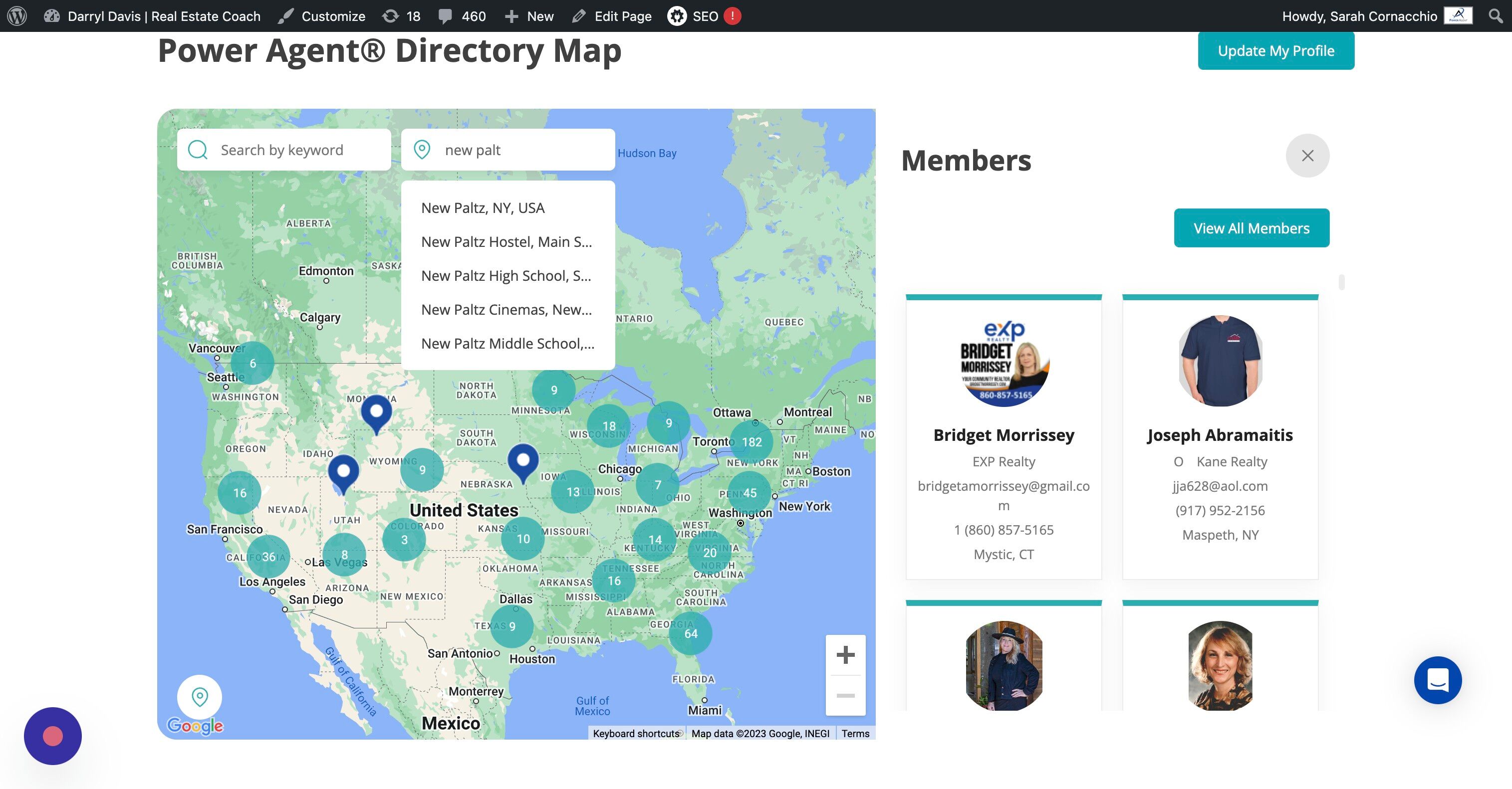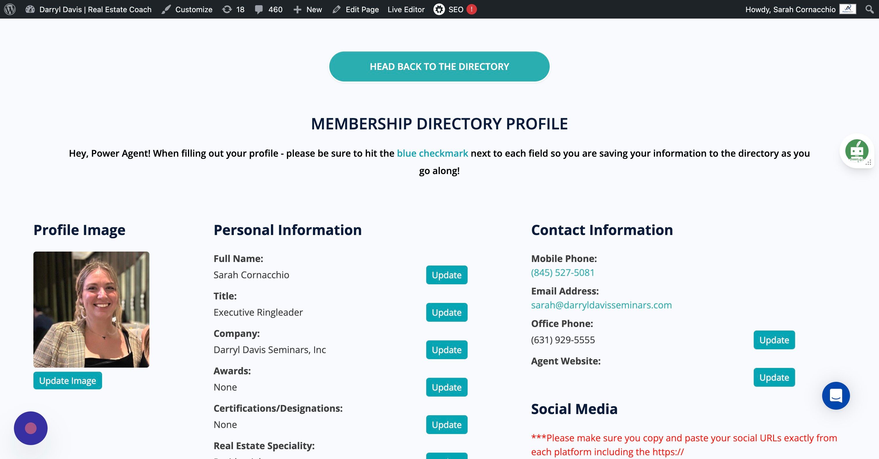 Tutorial – How to Update Your Directory Profile & Use the Directory 1. Navigate to the Dashboard. 2. Click "Directory of Power Agents®" 3. Click "Update My Profile" 4. Click "Update" next to Full Name to update your display name. 5. Click the blue checkmark to save that field. 6. Click "Update" 7. Type in your title, then click the blue checkmark to save that field. 8. Repeat this process for all the fields on your profile! 9. Remember to always click the blue checkmark to save that field. 10. To update your social media pages, click "Update" next to the field you'd like to update. In this example, I'm updating my Facebook page. 11. Navigate to https://www.facebook.com/ 12. Click your profile photo to choose your Facebook profile. 13. Select the profile you want to enter into the Directory. 14. Copy the url (CTRL+C) in the URL bar exactly as it is! 15. Head back to the tab where you were updating your Directory Profile, and paste (CTRL+V) that in that field. Click the blue checkmark to save the field! 16. Click "Add New Location" 17. Click the "Enter a location" field. 18. Type the city you are in. 19. Click "Save" 20. Click "Update" to enter your bio. 21. Type out your bio! 22. Click the blue checkmark to save that field. 23. Click "HEAD BACK TO THE DIRECTORY" 24. Click the "City, state or zip" field. 25. Type in a city to see the agents there! 26. In this example, I'm entering "New Paltz, NY, USA" 27. Click the "Search by keyword" field. 28. Type your criteria into the search. You can input a name, designation, award, language spoken, or anything else except for a Location! 29. Choose the member you were looking for!