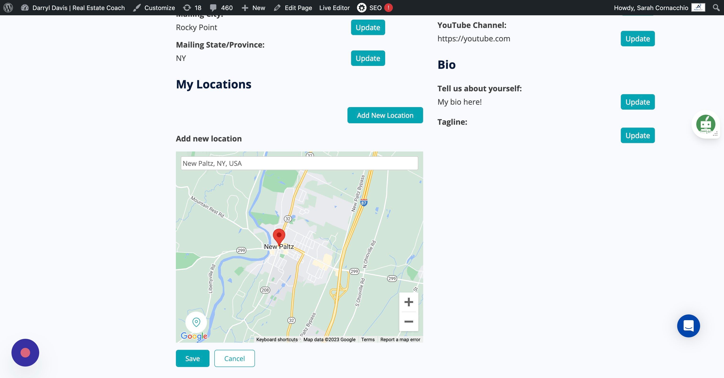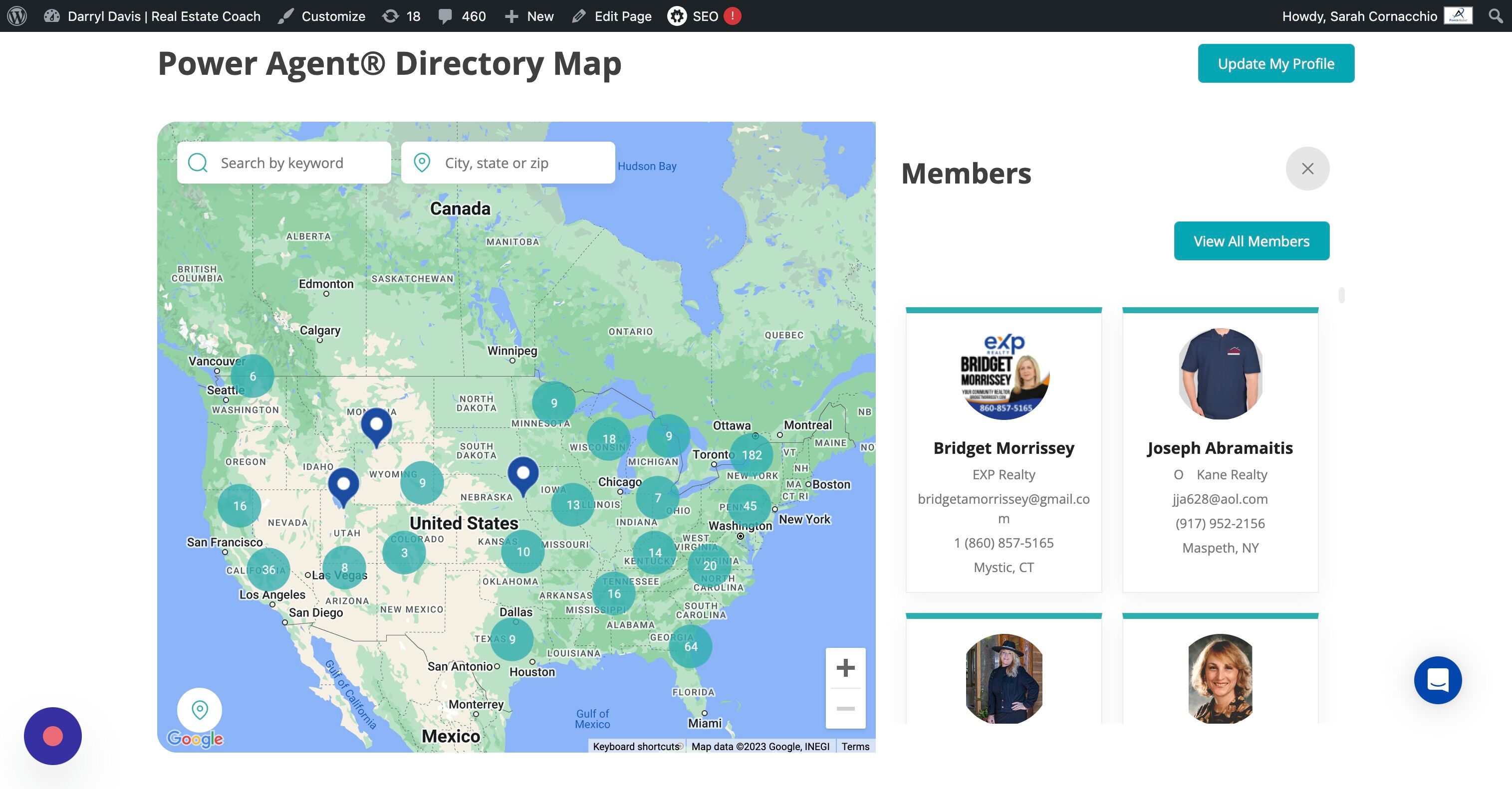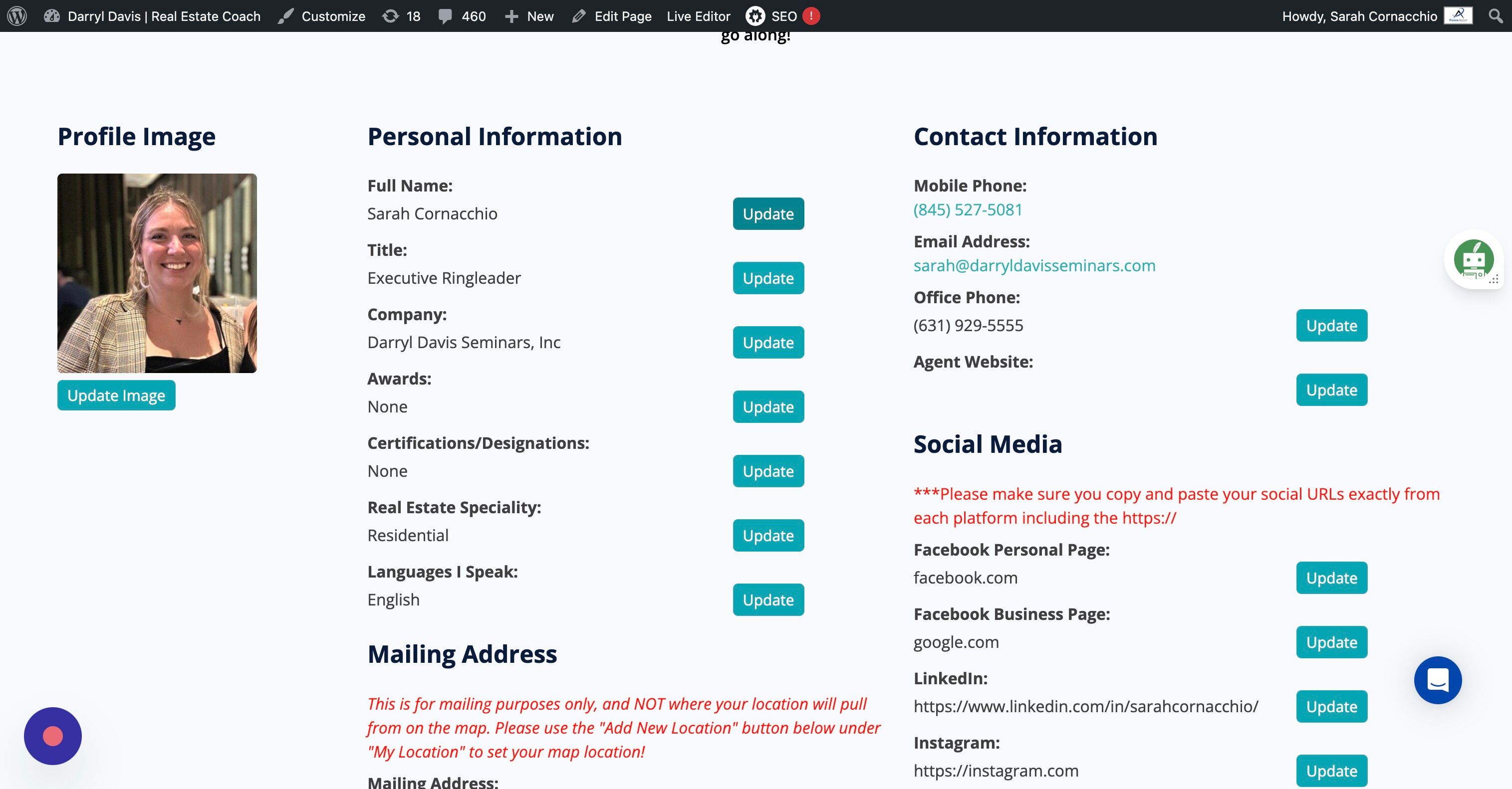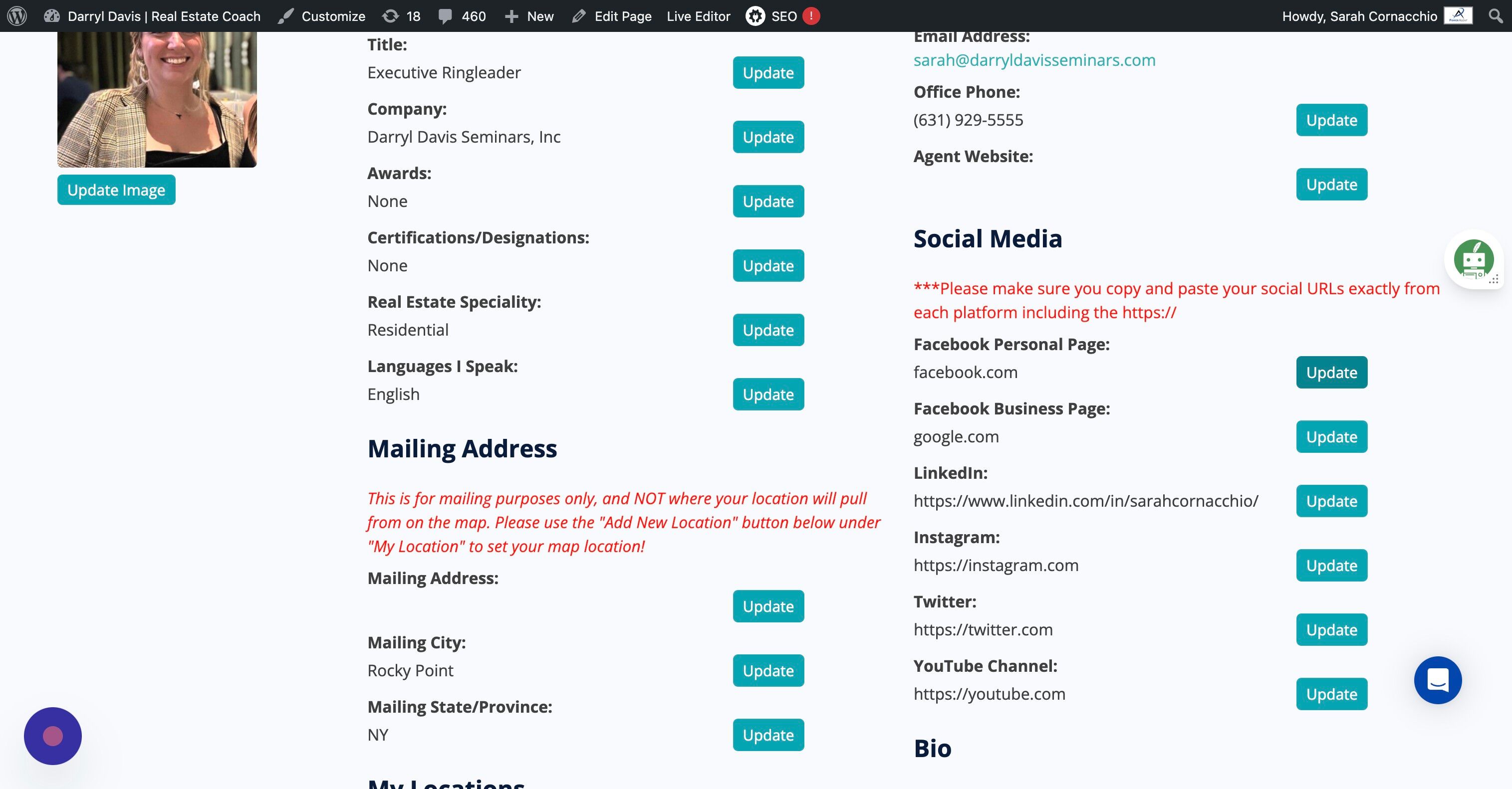 Tutorial – How to Update Your Directory Profile & Use the Directory 1. Navigate to the Dashboard. 2. Click "Directory of Power Agents®" 3. Click "Update My Profile" 4. Click "Update" next to Full Name to update your display name. 5. Click the blue checkmark to save that field. 6. Click "Update" 7. Type in your title, then click the blue checkmark to save that field. 8. Repeat this process for all the fields on your profile! 9. Remember to always click the blue checkmark to save that field. 10. To update your social media pages, click "Update" next to the field you'd like to update. In this example, I'm updating my Facebook page. 11. Navigate to https://www.facebook.com/ 12. Click your profile photo to choose your Facebook profile. 13. Select the profile you want to enter into the Directory. 14. Copy the url (CTRL+C) in the URL bar exactly as it is! 15. Head back to the tab where you were updating your Directory Profile, and paste (CTRL+V) that in that field. Click the blue checkmark to save the field! 16. Click "Add New Location" 17. Click the "Enter a location" field. 18. Type the city you are in. 19. Click "Save" 20. Click "Update" to enter your bio. 21. Type out your bio! 22. Click the blue checkmark to save that field. 23. Click "HEAD BACK TO THE DIRECTORY" 24. Click the "City, state or zip" field. 25. Type in a city to see the agents there! 26. In this example, I'm entering "New Paltz, NY, USA" 27. Click the "Search by keyword" field. 28. Type your criteria into the search. You can input a name, designation, award, language spoken, or anything else except for a Location! 29. Choose the member you were looking for!