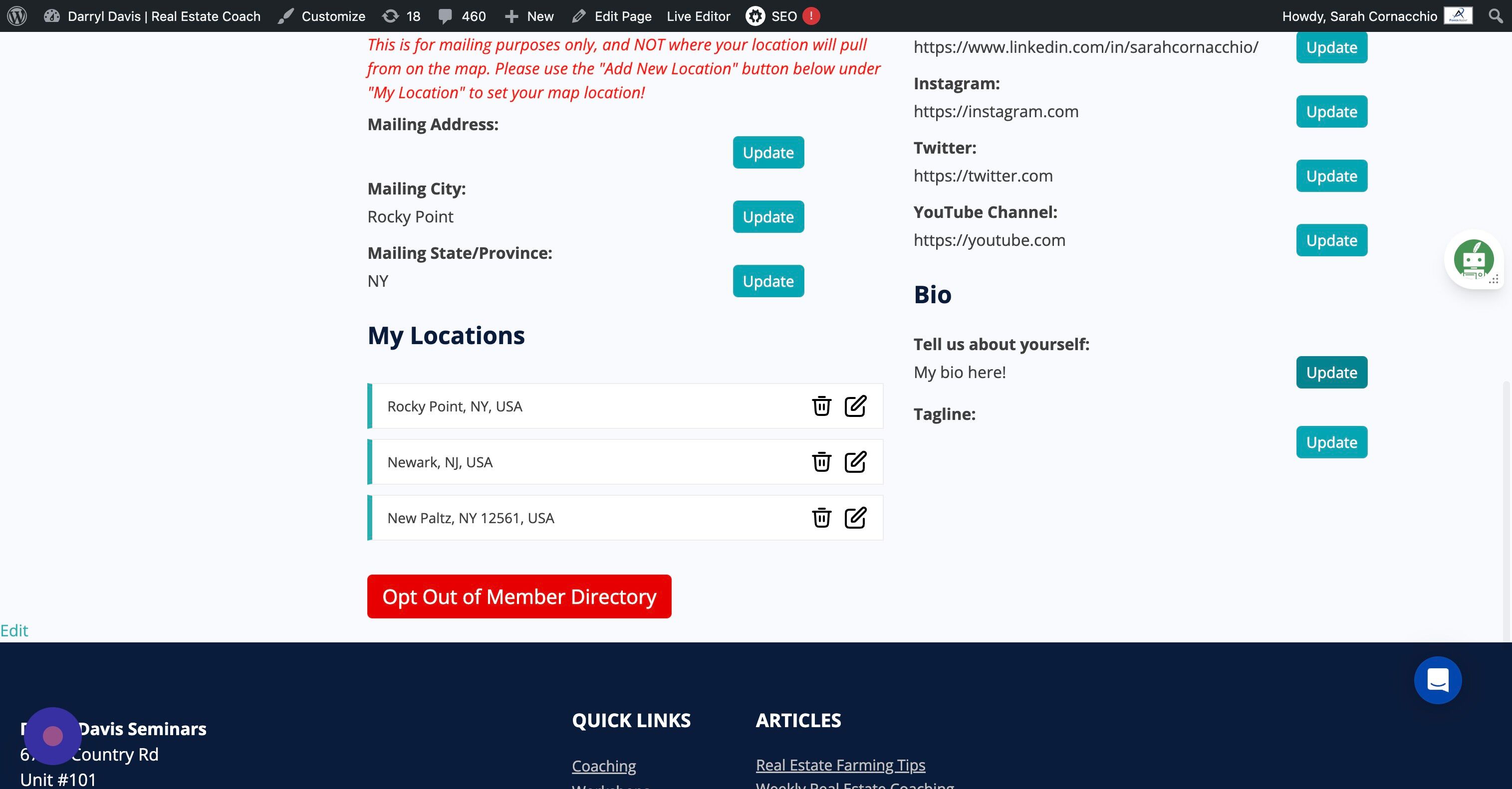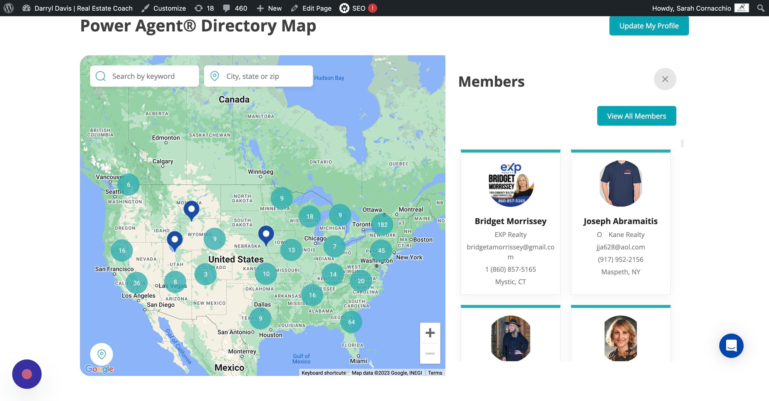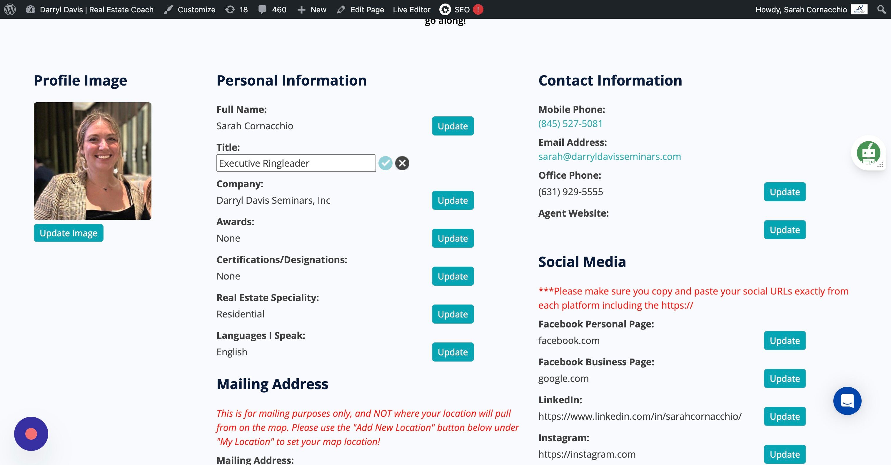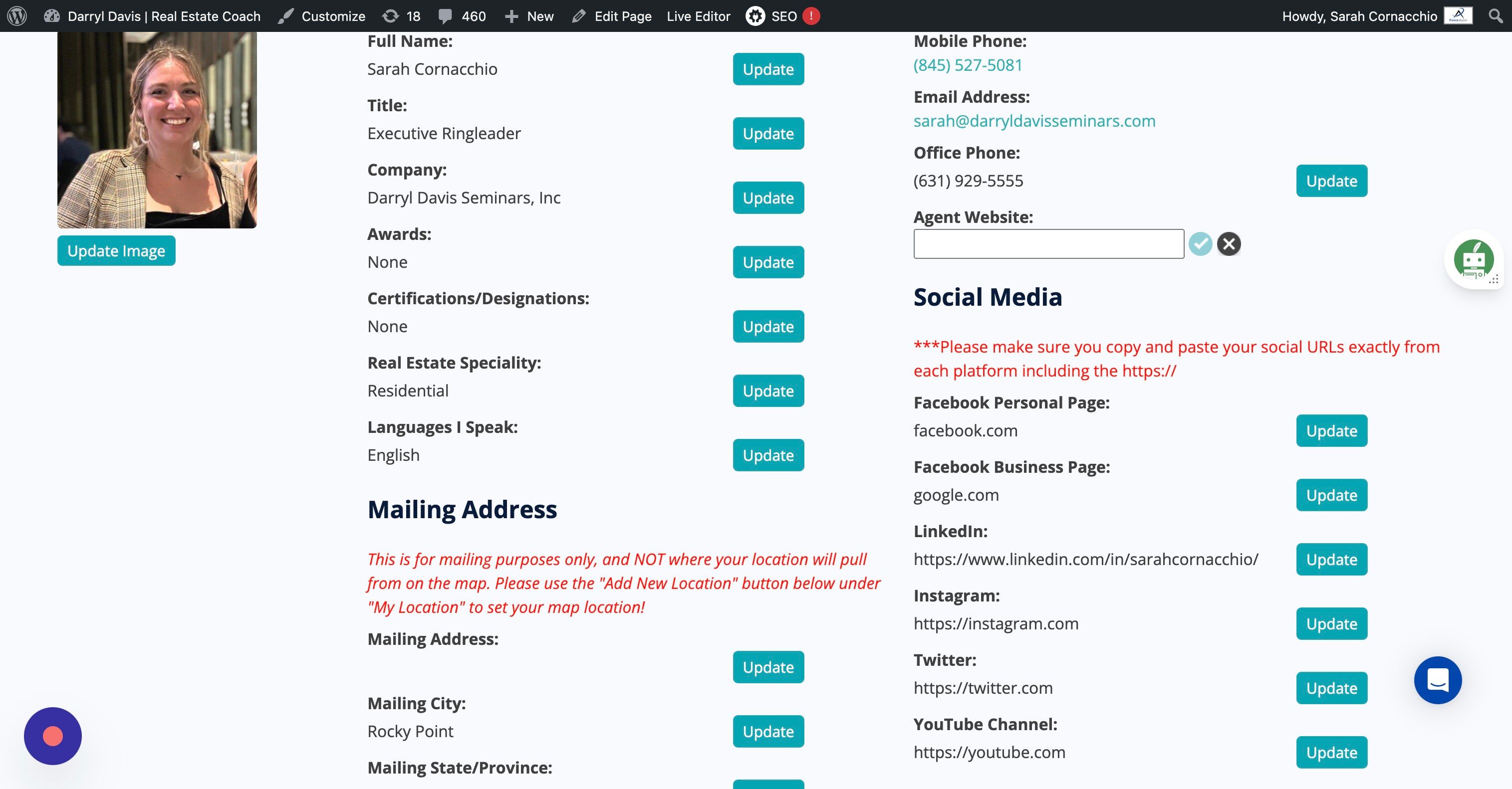 Tutorial – How to Update Your Directory Profile & Use the Directory 1. Navigate to the Dashboard. 2. Click "Directory of Power Agents®" 3. Click "Update My Profile" 4. Click "Update" next to Full Name to update your display name. 5. Click the blue checkmark to save that field. 6. Click "Update" 7. Type in your title, then click the blue checkmark to save that field. 8. Repeat this process for all the fields on your profile! 9. Remember to always click the blue checkmark to save that field. 10. To update your social media pages, click "Update" next to the field you'd like to update. In this example, I'm updating my Facebook page. 11. Navigate to https://www.facebook.com/ 12. Click your profile photo to choose your Facebook profile. 13. Select the profile you want to enter into the Directory. 14. Copy the url (CTRL+C) in the URL bar exactly as it is! 15. Head back to the tab where you were updating your Directory Profile, and paste (CTRL+V) that in that field. Click the blue checkmark to save the field! 16. Click "Add New Location" 17. Click the "Enter a location" field. 18. Type the city you are in. 19. Click "Save" 20. Click "Update" to enter your bio. 21. Type out your bio! 22. Click the blue checkmark to save that field. 23. Click "HEAD BACK TO THE DIRECTORY" 24. Click the "City, state or zip" field. 25. Type in a city to see the agents there! 26. In this example, I'm entering "New Paltz, NY, USA" 27. Click the "Search by keyword" field. 28. Type your criteria into the search. You can input a name, designation, award, language spoken, or anything else except for a Location! 29. Choose the member you were looking for!